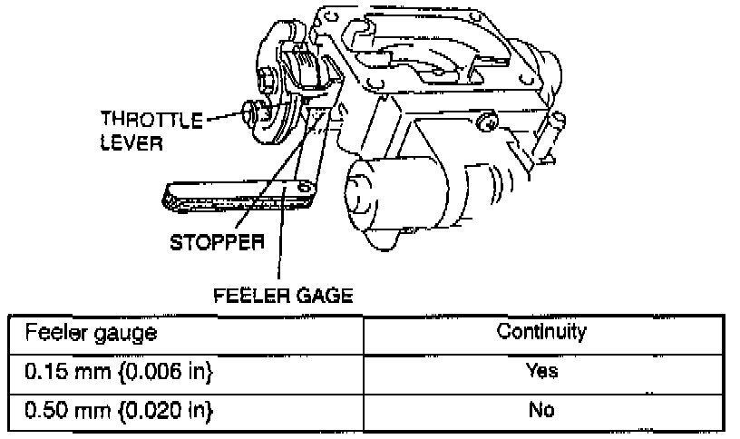 3. Insert a feeler gauge between the stopper and the throttle lever and check the continuity between terminals.