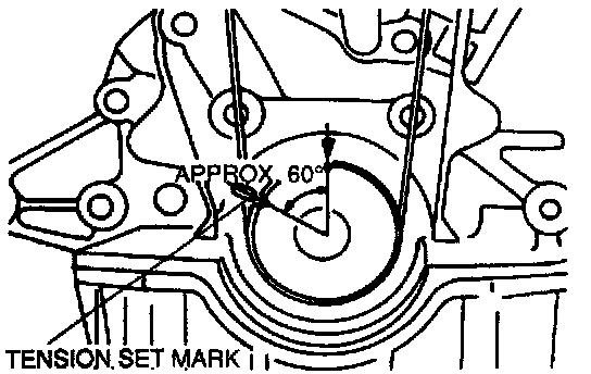 7. Turn the crankshaft 1 and 5/6 turns clockwise, and align the timing belt pulley mark with the tension set mark for proper timing belt tension adjustment.