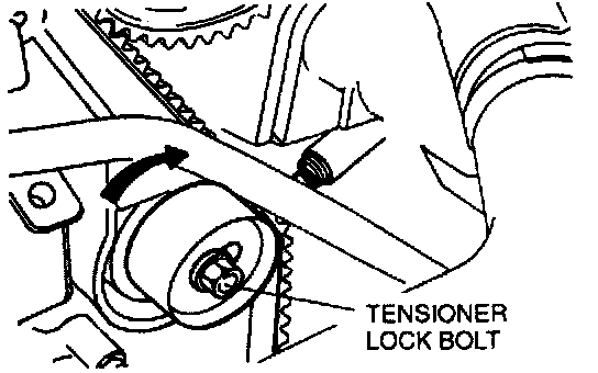 10. Loosen the tensioner lock bolt to apply spring tension to the timing belt.