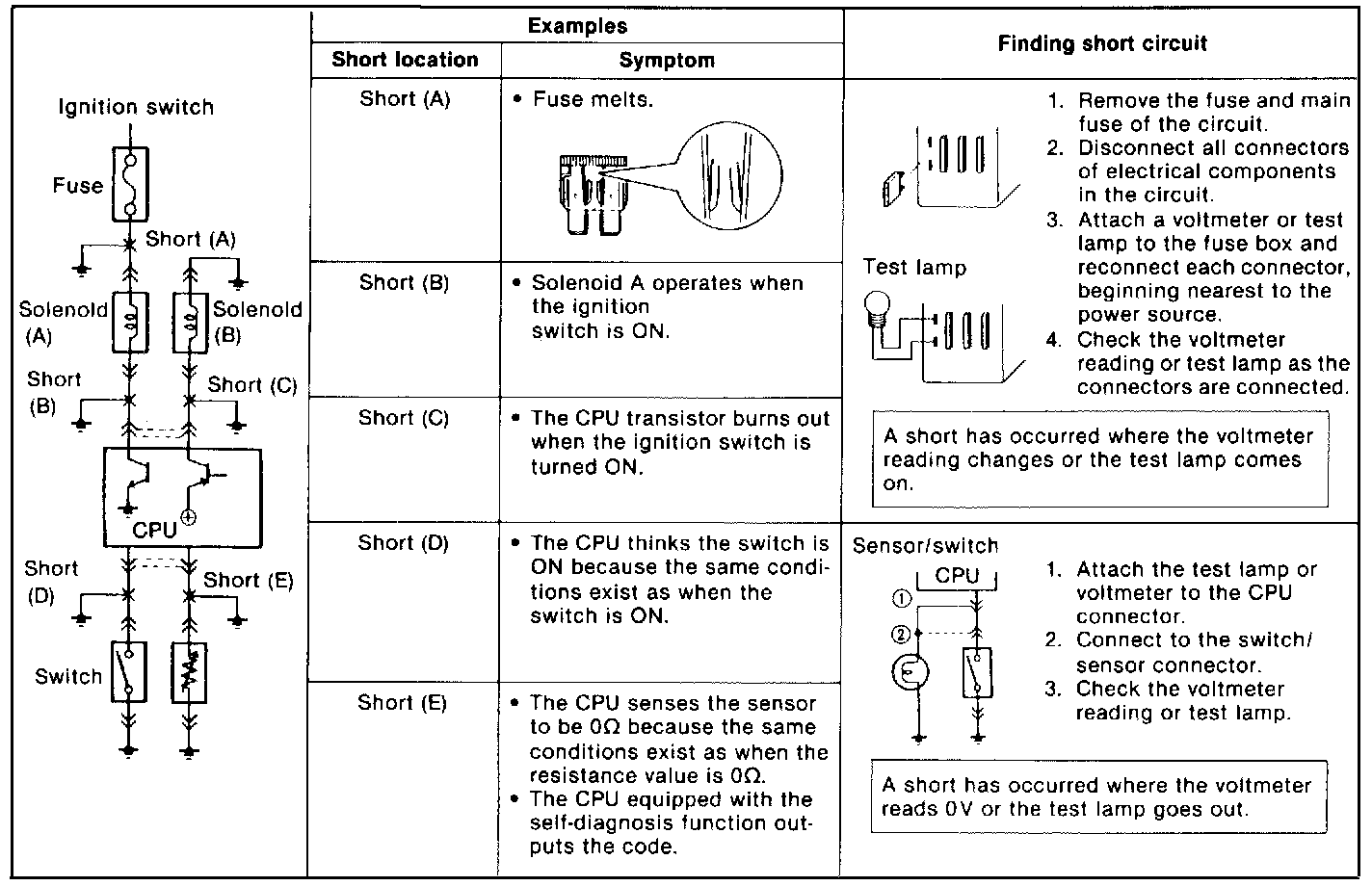 Shorts occur between the power (positive) and ground (negative) sides of a circuit. Therefore, finding a short circuit requires determining how the circuit is routed.Finding Short Circuits-Circuits Not Connected To Control Unit: