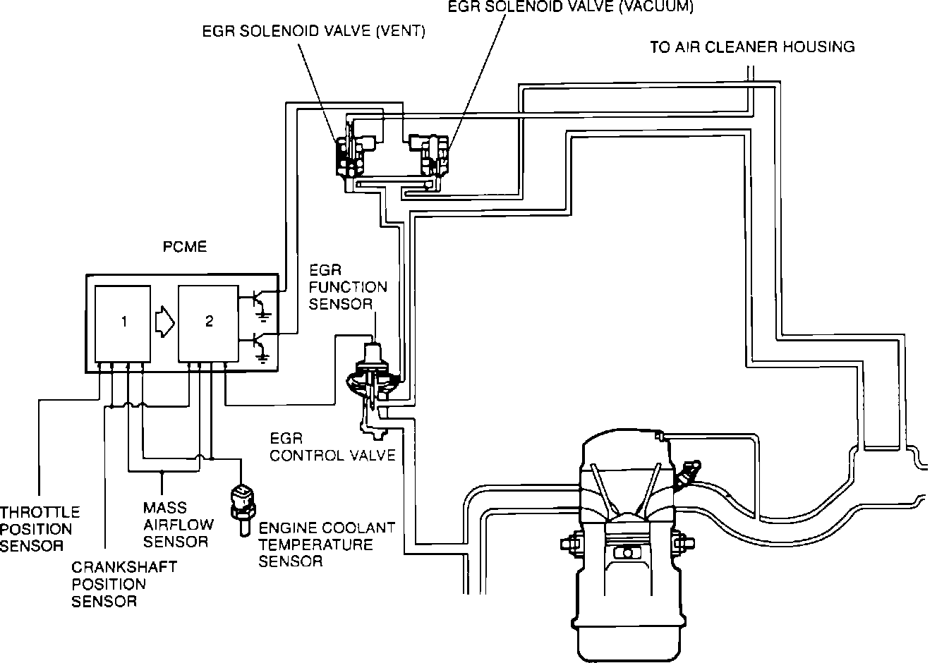 System recirculates a portion of exhaust gas through the EGR valve and intake manifold into the combustion chambers. Valve operation is PCME controlled with the vacuum and vent solenoid valves. To improve driveability when engine is cold, system does not operate when coolant temperature is below 131°F (55°C).
