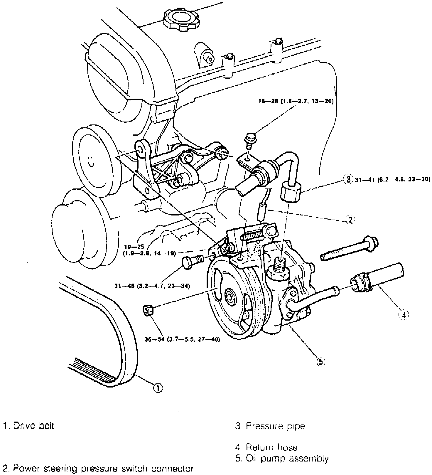 1. Remove components in numerical sequence shown in Fig. 13. Mark pressure pipe for installation reference before loosening.Fig. 13 Power Steering Pump & Related Components: