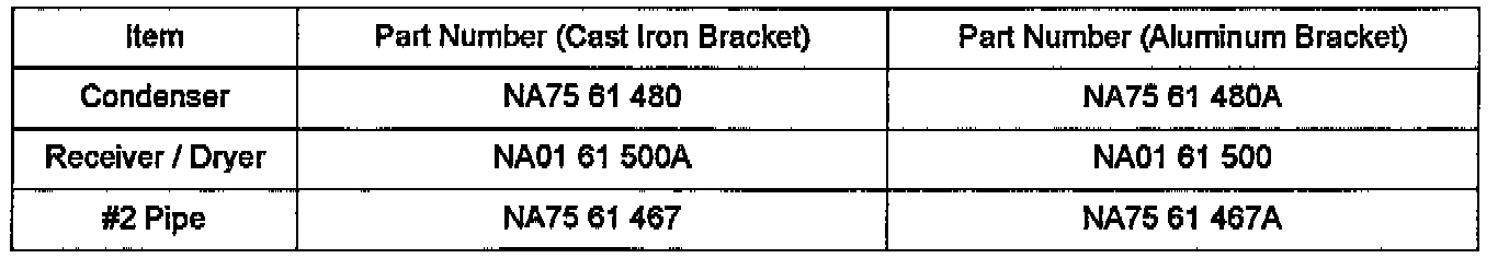 Two different types of condensers, receiver driers and # 2 pipes (see note) are used on the listed models. These components are not interchangeable. Use the following method and the application chart to identify the correct replacement components.
