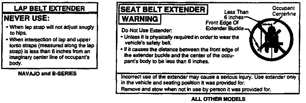 The "Warning Label" shown is affixed to the seat belt extender. The proper usage and safety related warning listed on the extender must be explained to the customer when the extender is delivered.