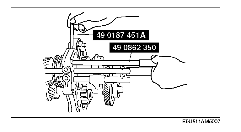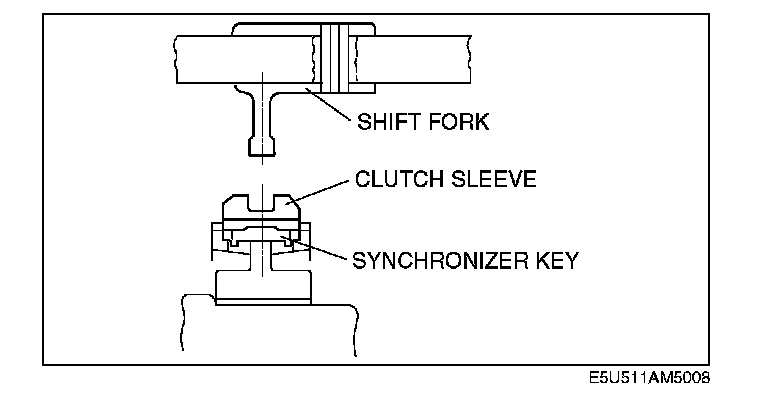 5. Verify that the centers of the shift fork and clutch hub sleeve are aligned properly. If they are not, select the proper washer to install between 1st gear and the mainshaft front bearing, and between reverse gear and the mainshaft front bearing.