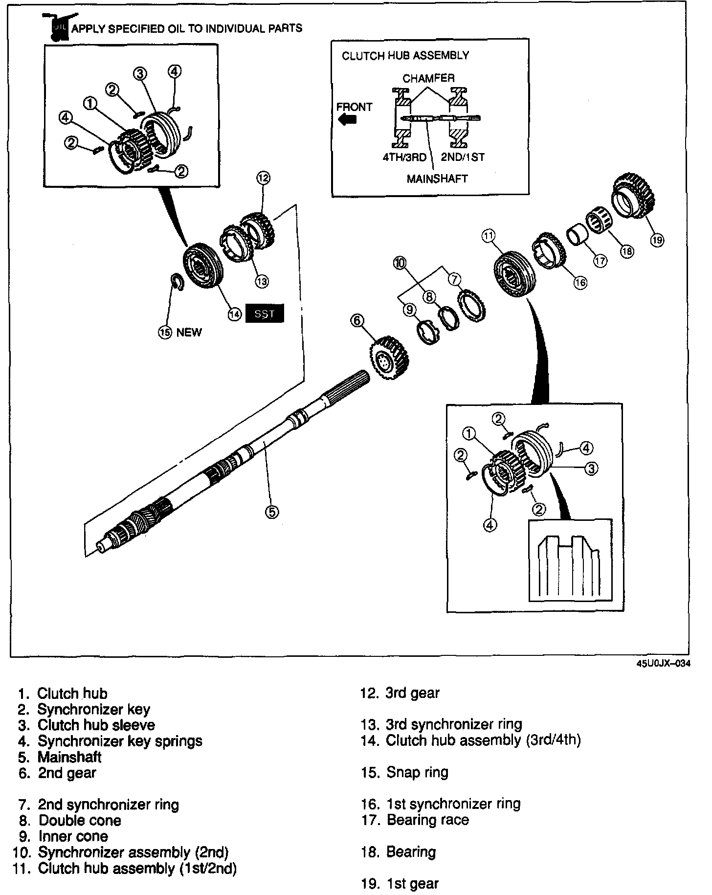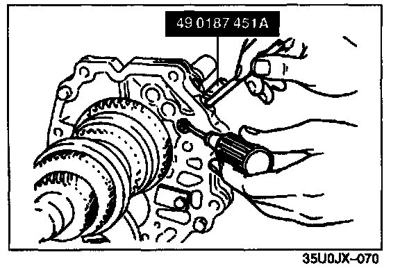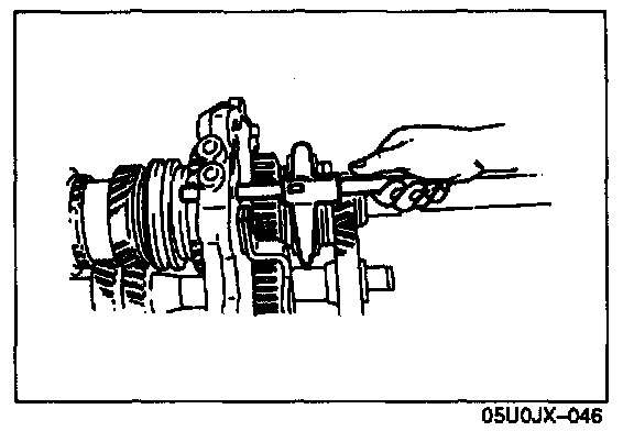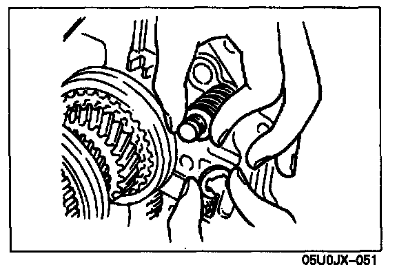 1. Shift the clutch hub sleeves into 1st and Reverse gears to lock the rotation of the mainshaft.