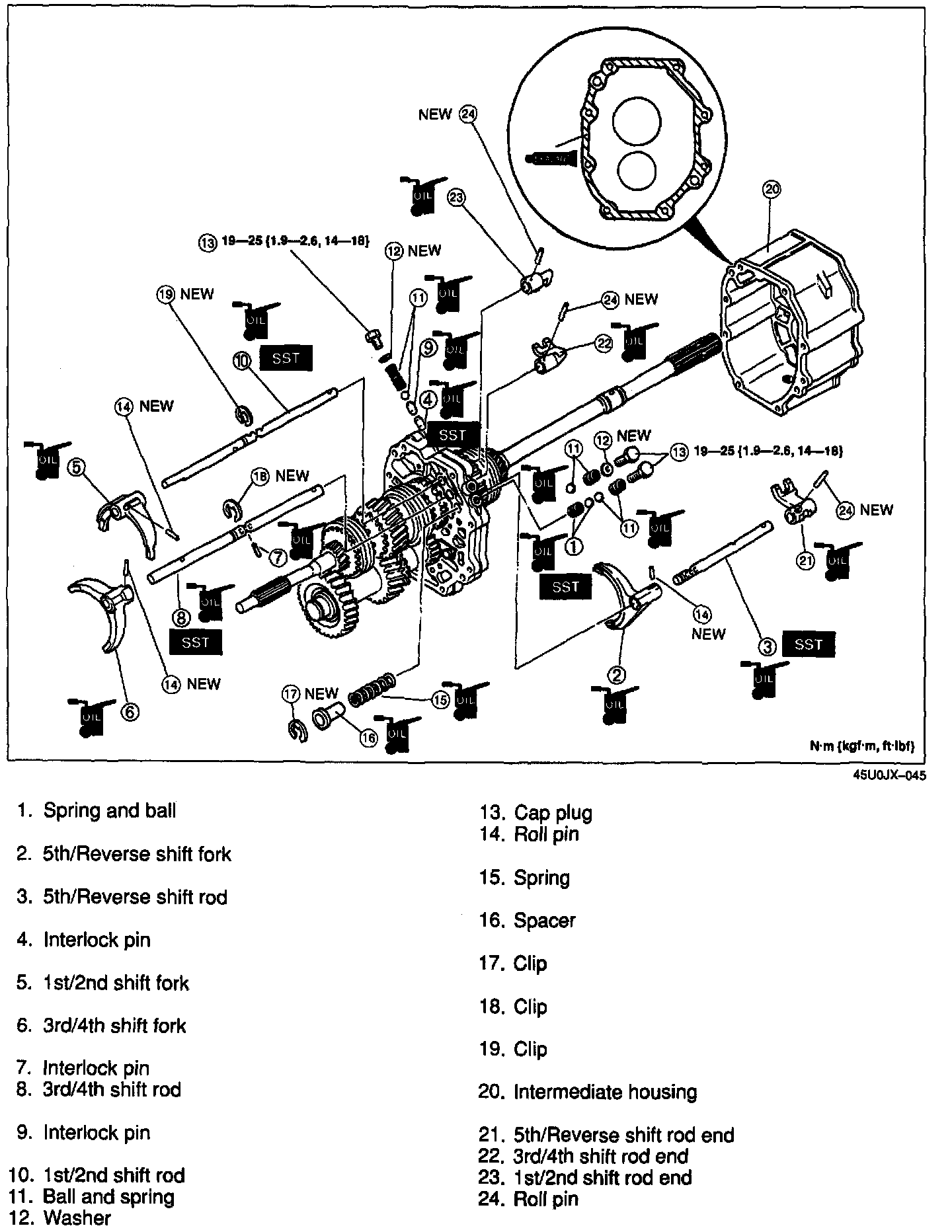Install a new roll pin into each shift fork. The roll pin must be installed with the split facing as shown.