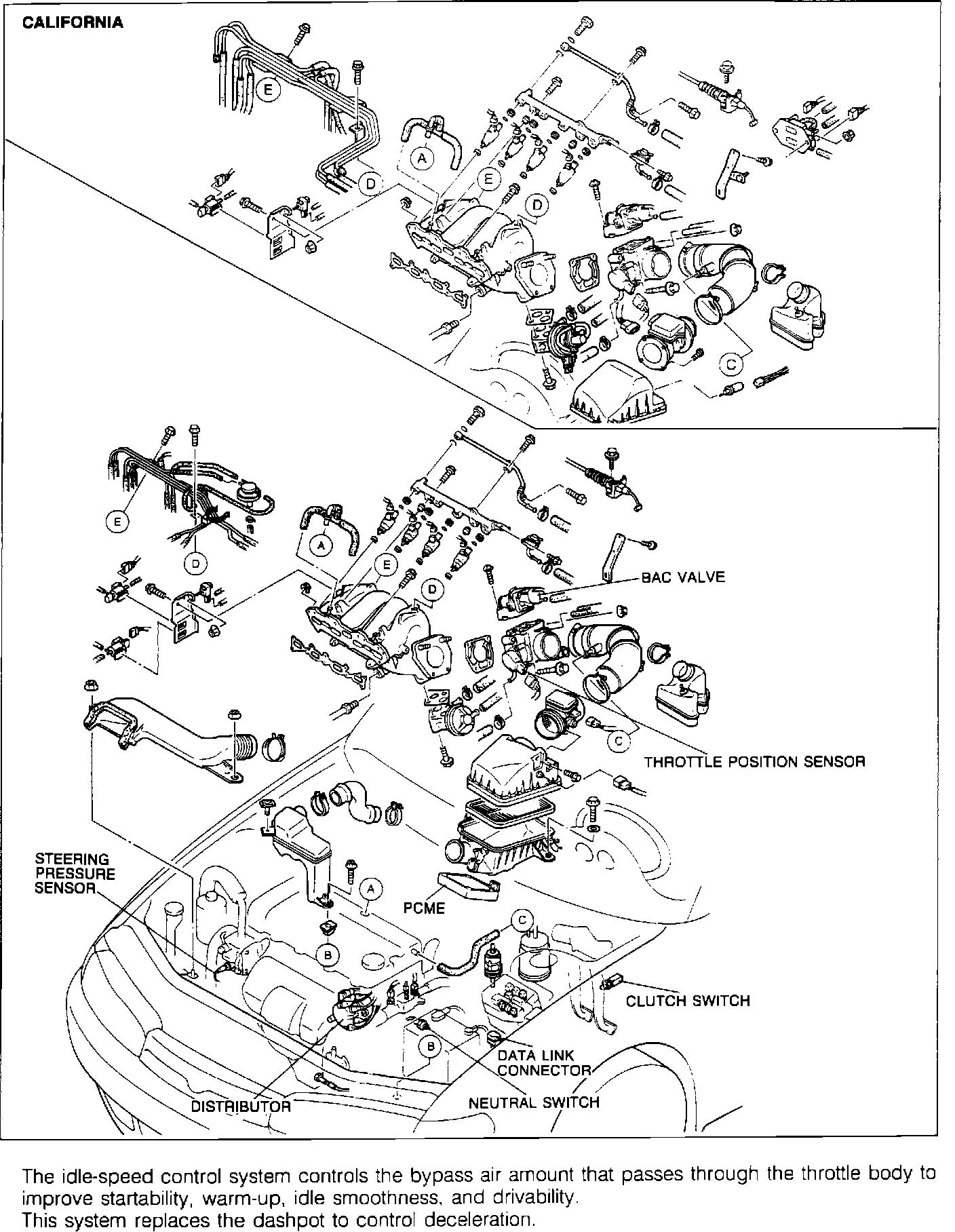 Bypass Air Control Valve (BAC) consists of a PCME controlled idle air control valve and an air valve that opens and closes according to engine coolant temperature. The air valve is open on cold start and closes by the time operating temperature is reached. The idle air control valve is PCME controlled to allow bypass air compensation according to a number of inputs (engine temperature, load from P/S, A/C, and A/T).
