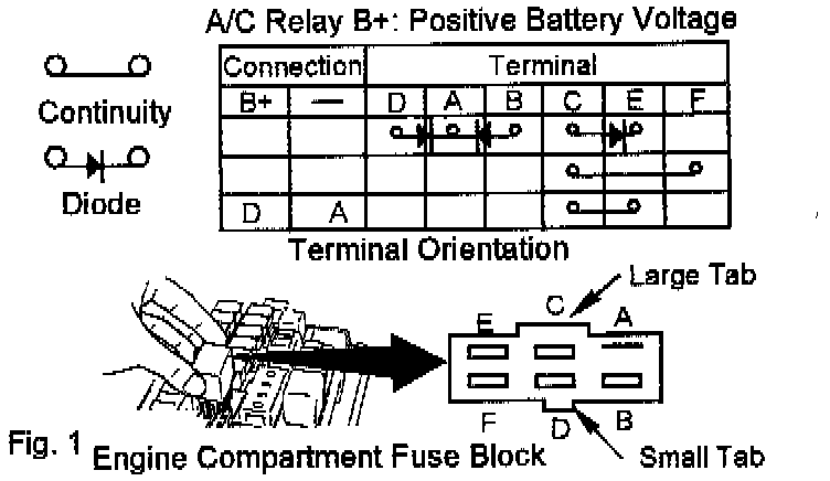 2. Remove the A/C relay and check for continuity according to Fig. 1 and 2.