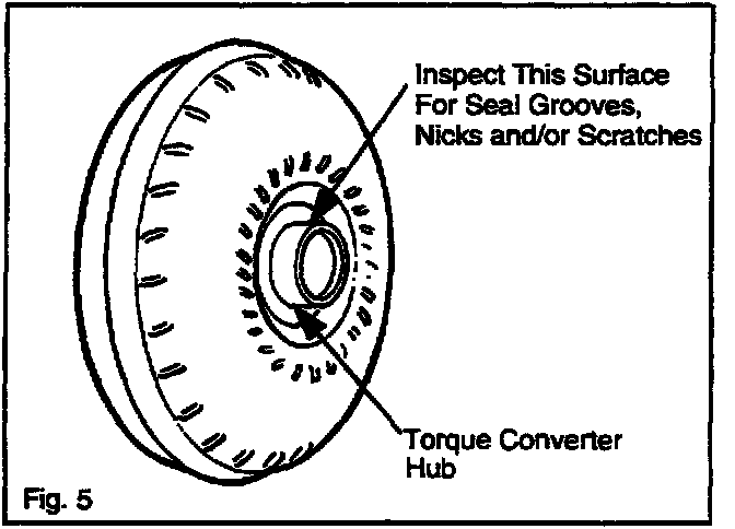 ^ Damaged to the converter hub seal may be caused by scratches or nicks on the mating surface between the hub seal and torque converter.