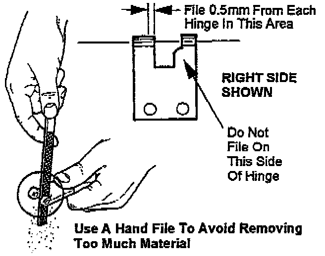 4. File 0.5 mm from the outside edges of both glove box hinge towers.