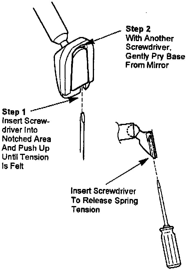 ^ Insert a small flat head screwdriver into the notch of the mirror assembly until tension is felt (mirror base is held to the mirror using spring tension). Refer to Fig. 1.