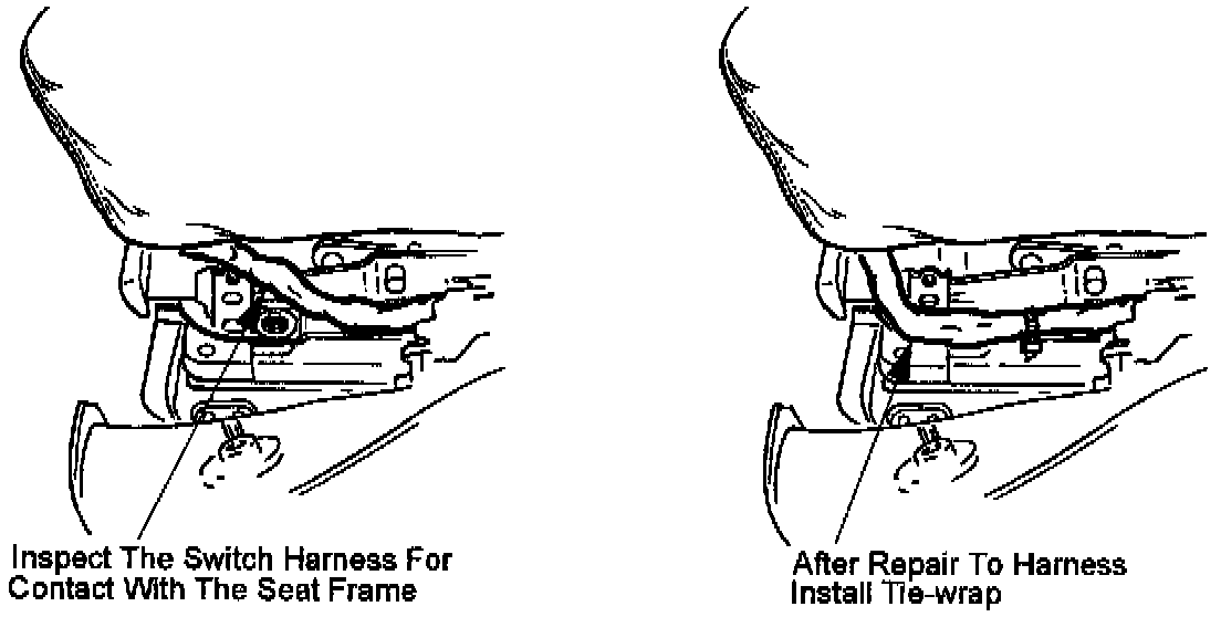 3. Inspect the seat switch harness for signs of contact with the seat frame (bare or pinched wires). Repair as necessary.