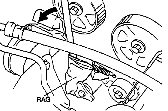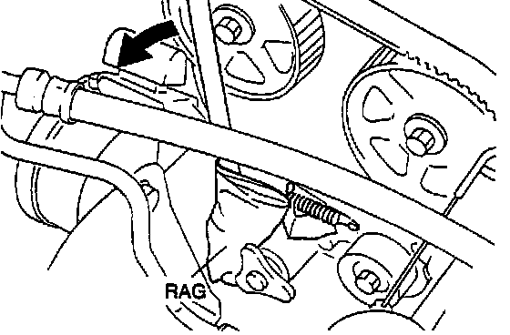 5. Protect the tensioner with a rag. Loosen the tensioner lock bolt and pry the tensioner outward with a bar.