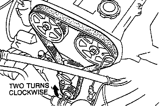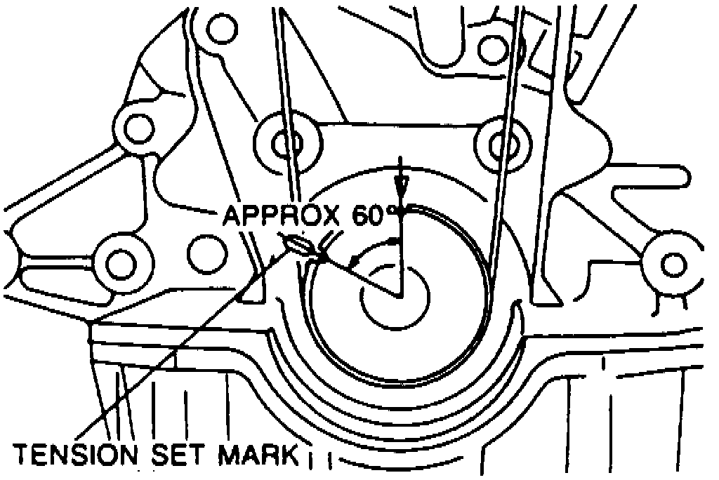 7. Turn the crankshaft 1 and 5/6 turns clockwise and align the timing belt pulley mark with the tension set mark for proper timing belt tension adjustment.
