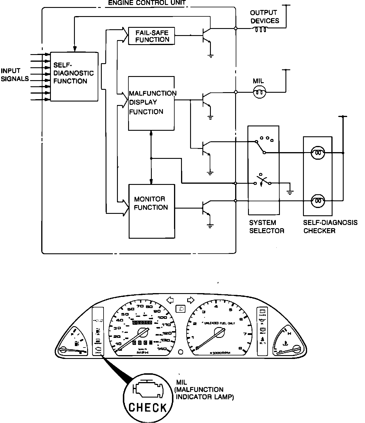 Malfunction indicator light (MIL) informs the driver when a malfunction is detected in an ECU monitored device. Also used to read trouble codes stored in ECU memory.