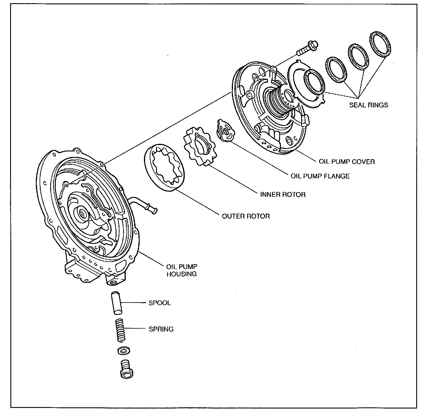 An outer rotor, inner rotor, and oil pump flange are installed within the pump housing of the trochoid gear oil pump. The oil pump flange and oil pump shaft are coupled to the inner rotor. The other end of the oil pump shaft is coupled to the pump impeller side of the torque converter, and via the converter, to the engine. As a result, the oil pump flange, the inner rotor, and the outer rotor rotate unitedly with the engine. A spool and spring installed in the discharge section of the pump housing regulates the oil discharge.