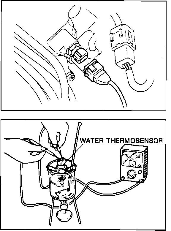 1. Disconnect water thermosensor connector. Remove sensor from engine.