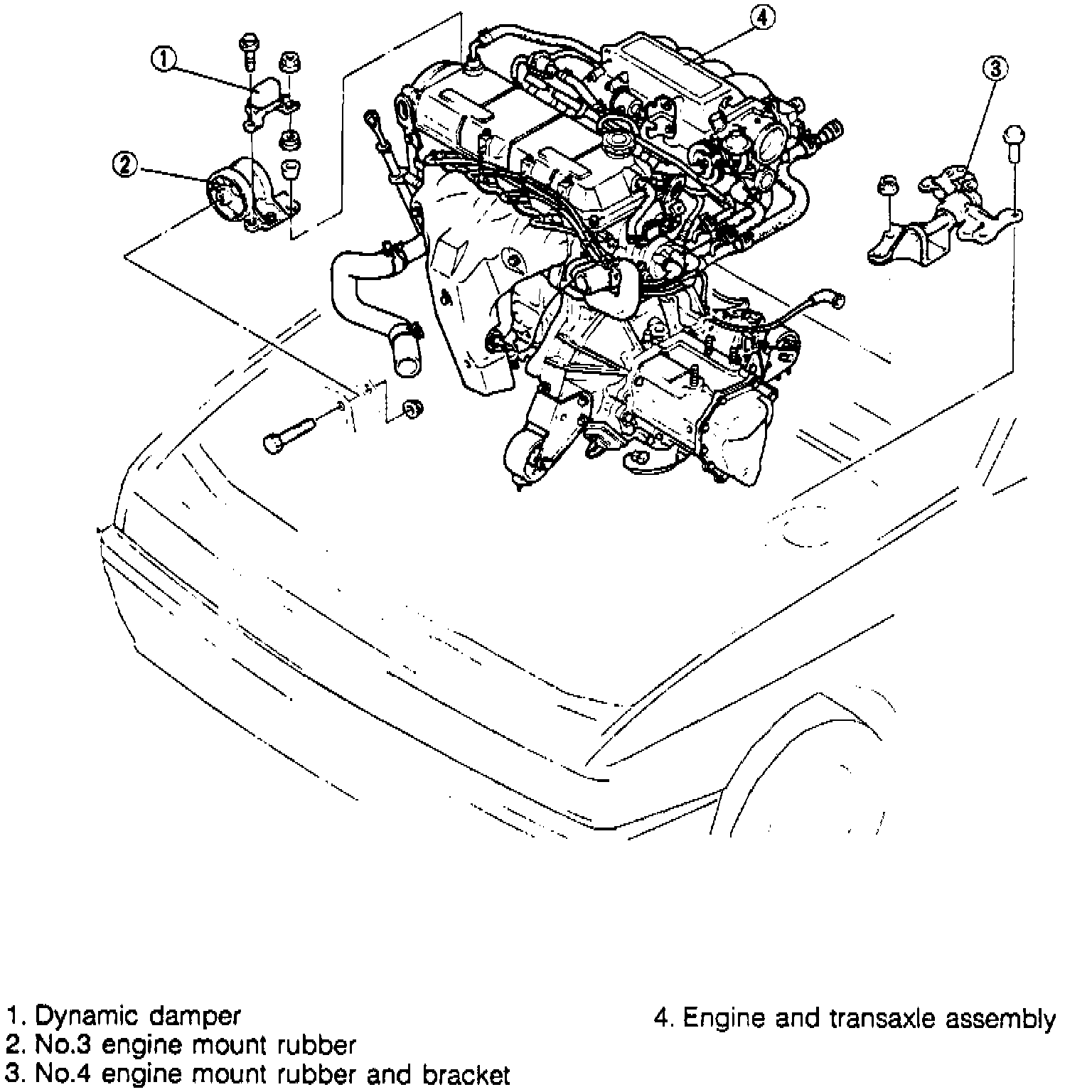 b. Suspend engine with a chain block or equivalent, then remove No. 1 and No. 2 engine mount retaining nuts from engine mount crossmember.