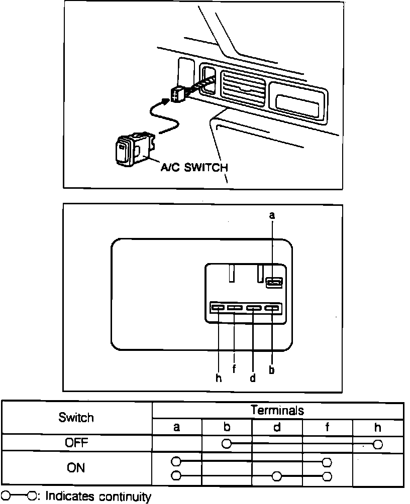 Remove A/C switch and check continuity between terminals as indicated on image chart.