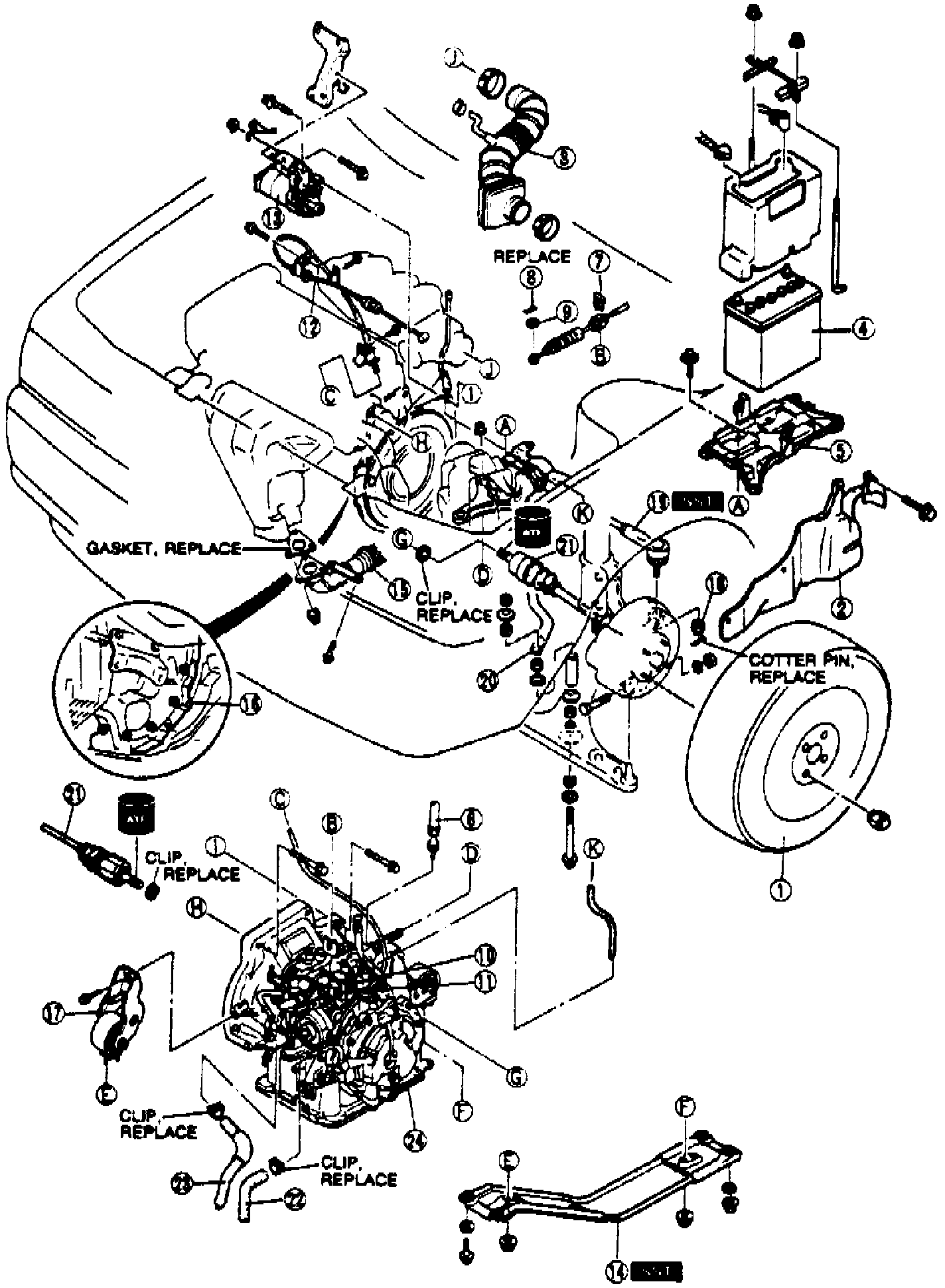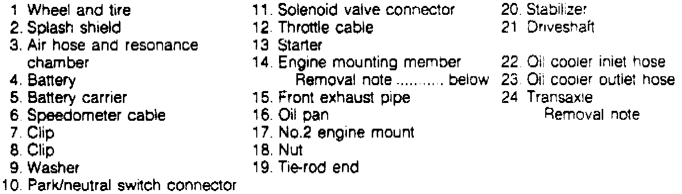 Refer to Fig. 9 when replacing the transaxle.1. Disconnect battery ground cable, then raise and support vehicle.