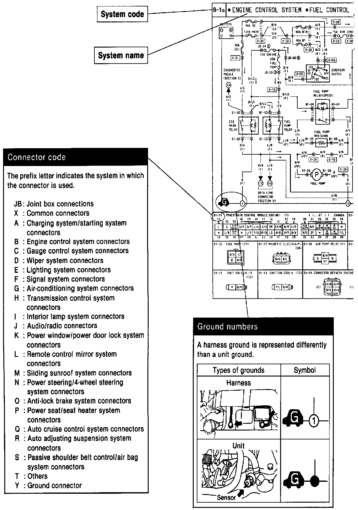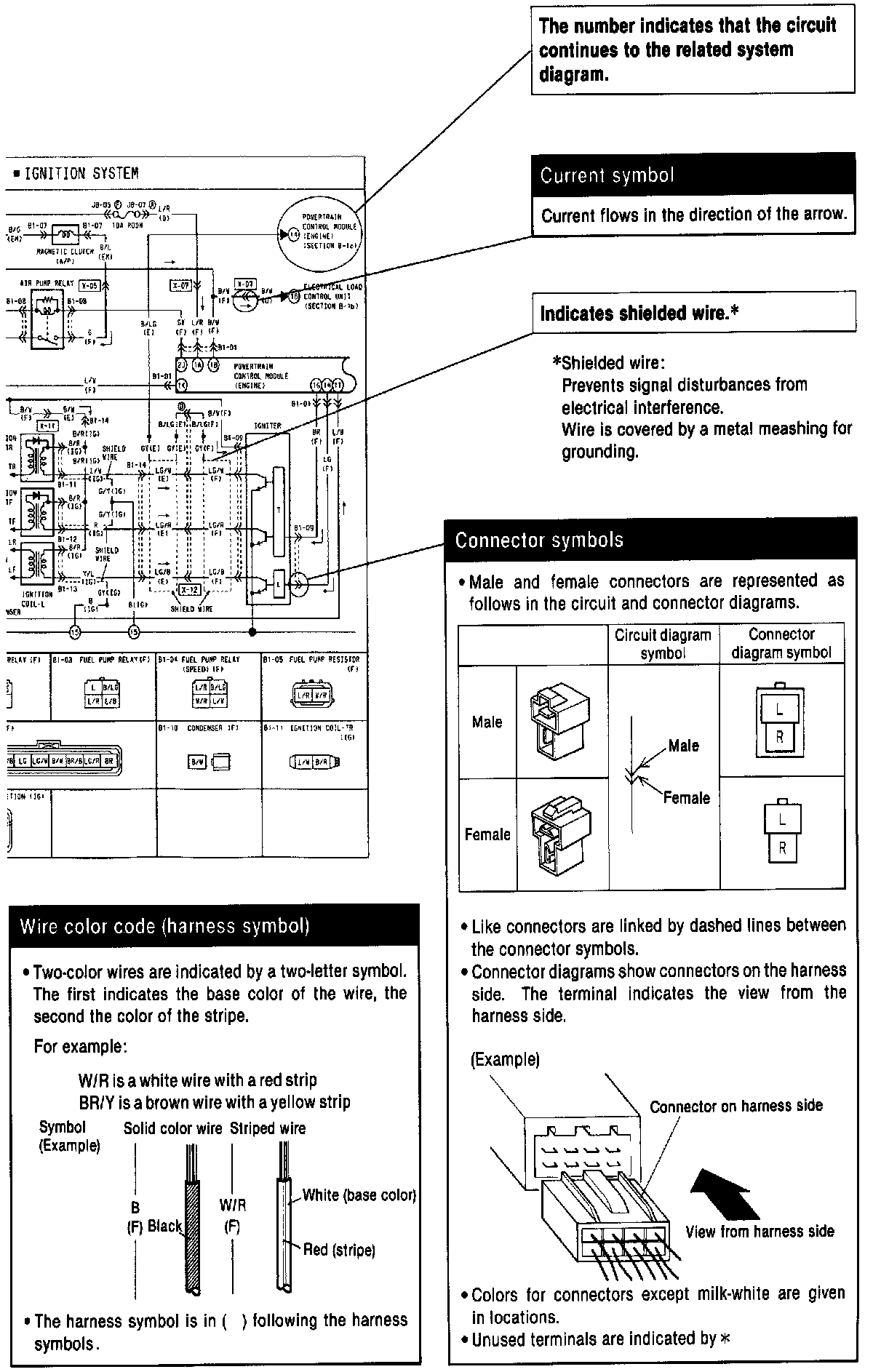 ^ These show the circuits for each system, from the power supply to the ground. The power supply side is on the upper part of the page, the ground side on the lower part. The diagrams describe circuits with the ignition switch off.