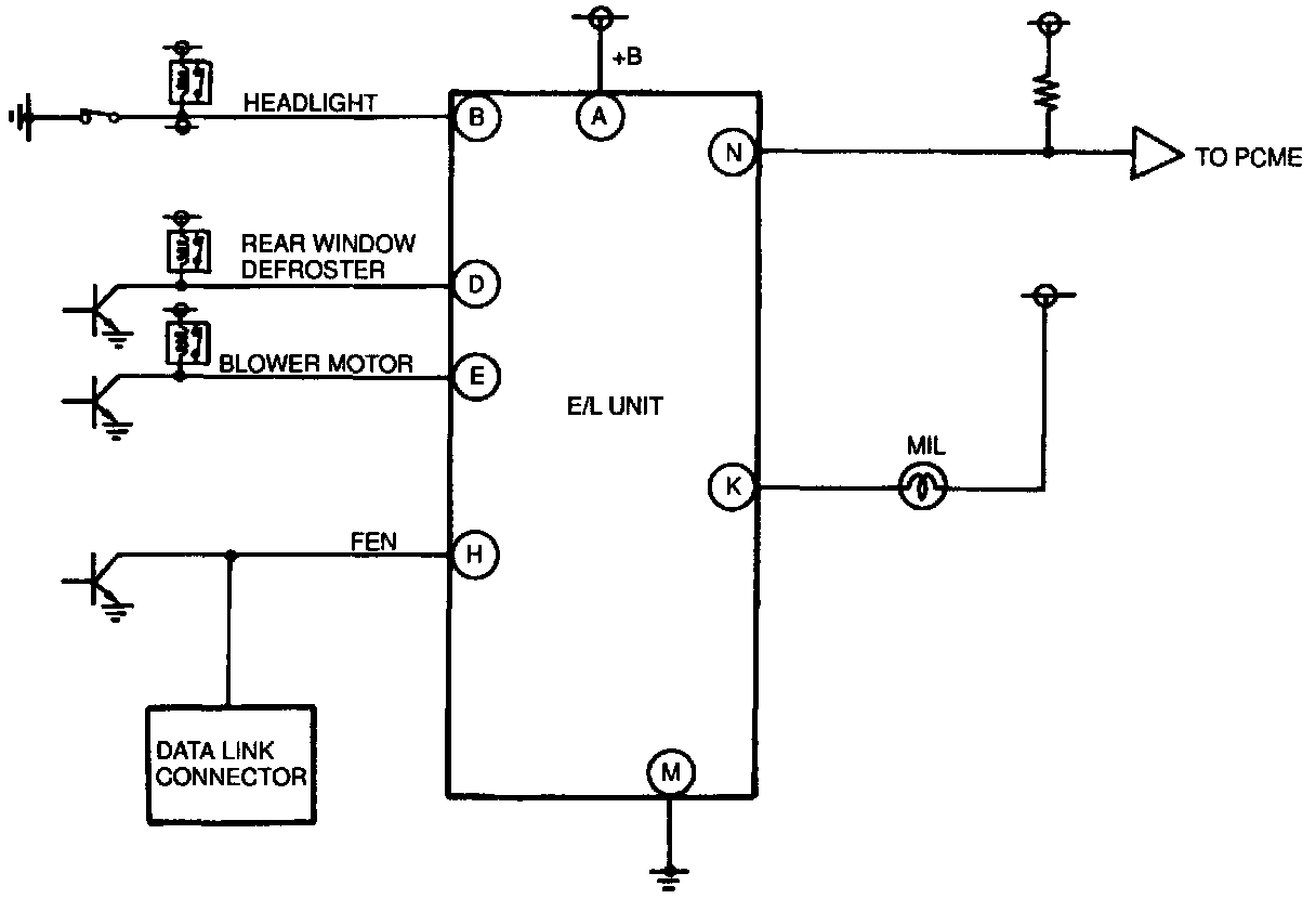 When switched "ON," these loads cause E/L unit to signal PCME to raise idle speed through its control of idle air control system: