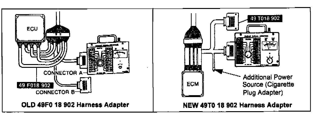 The Special Service Tool (SST) involved in this program is the RX-7 harness adapter (49FO-18-902). It was a Minimum Required Tool (MRT). This harness adapter has been discontinued by Mazda's tool vendor (America Kowa Seiki, Inc.) and has been replaced by a new harness adapter (49TO-18-902) which is applicable to both the RX-7 and the new 1995 Millenia. This new tool is now a MRT. The cost of this new harness adapter is $457.71. The visible difference between the two harness adapters is that the new harness adapter has an added power source (a cigarette plug adapter).