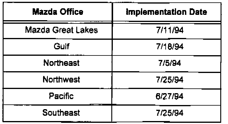 3. Since Mazda cannot update all 900+ dealer harness adapters at once, the program will be implemented one region at a time. This will help alleviate potential confusion and delays. The table lists each regional office and the date their dealers will be sent a Fed Ex box for them to begin participating in the program. Be sure to note when your dealer will be shipped its Fed Ex box.