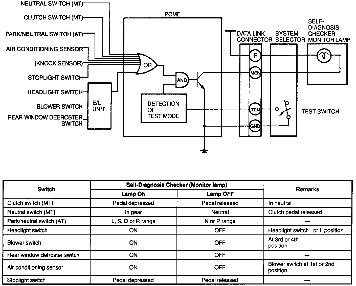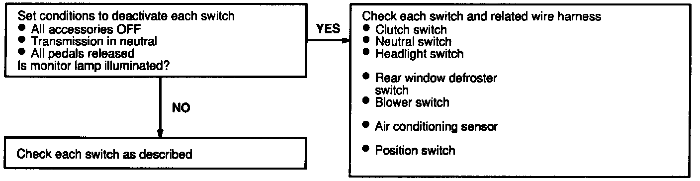 The TEN terminal of the data link connector must be grounded and the ignition switch turned to ON (engine OFF). If any switch remains activated, the monitor lamp will be illuminated.