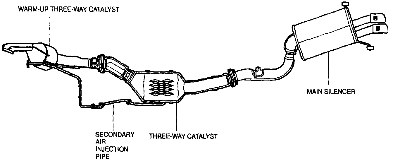 Two separate three-way catalysts are used to reduce CO, HC, and NOx emissions. For efficient operation, the warm-up three-way catalyst is placed close to the exhaust manifold so that it will heat up quickly and purify exhaust gas efficiently when engine runs at idle.