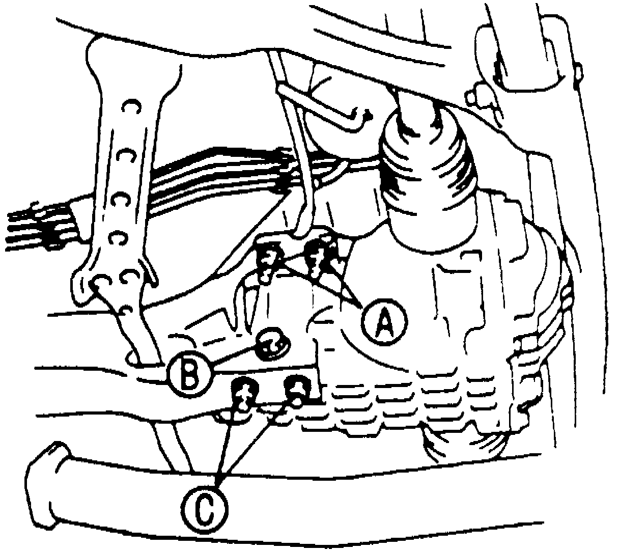 d. Tighten power plant frame differential side nuts and bolts in A-B-C sequence shown in Fig. 22. Torque A and C to 109 - 130 ft.lb. and B to 55 - 68 ft.lb.