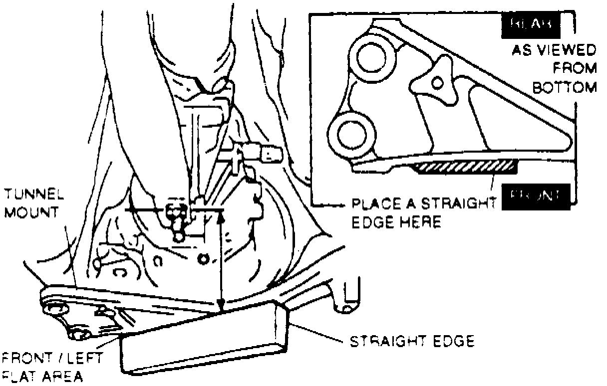 f. Place straightedge on flat area of front left edge of tunnel mount so it passes under power plant frame installation bolts, Fig. 24. Measure from top of straightedge to power plant frame. Clearance should be 2.76 - 3.03 inches. If not within specifications, adjust power plant frame.