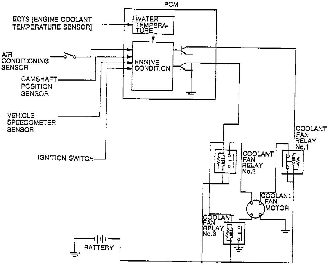 . This system consists of the coolant fan motor, fan relays, PCM and input devices.