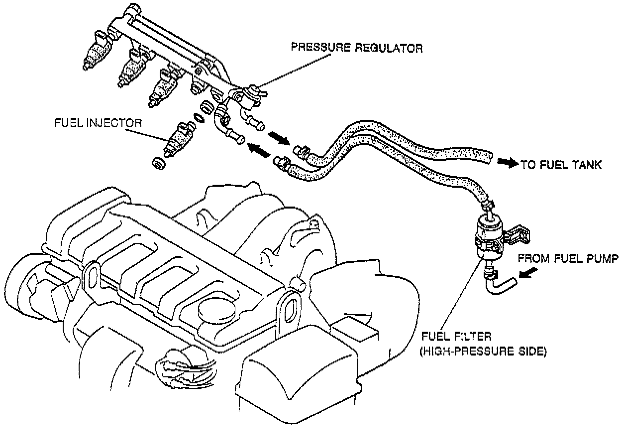 This system supplies the fuel to the fuel injectors at a constant pressure. Fuel is metered and injected into the [1][2]intake manifold according to injection control signals from the PCM. The system consists of the fuel tank, fuel pump, fuel filters, pressure regulator, pressure regulator control solenoid valve, fuel injectors, and fuel pump relay.