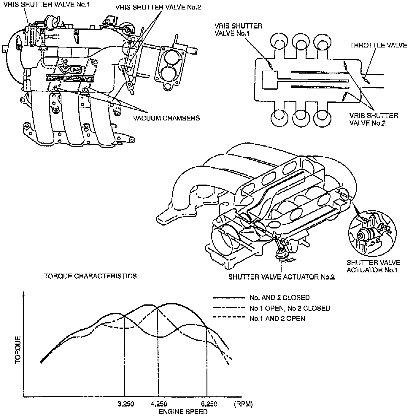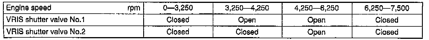 The inside of the dynamic chamber is divided into two sections, interconnected by two shutter valves and connecting pipes for Variable Resonance Induction System (VRIS) operation .This system opens and closes the shutter valves according to the engine speed to improve the charging efficiency by utilizing the pressure waves of the intake air.There are two vacuum chambers under the left bank of the intake manifold that are used to supply constant vacuum to the VRIS shutter valve actuators during wide-open throttle operation and other low-vacuum, low-speed situations.