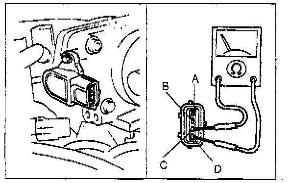 4. Insert a feeler gauge between the throttle adjusting screw (TAS) and the throttle lever. Adjust the continuity between the closed throttle position switch terminals C and D by using an ohmmeter.