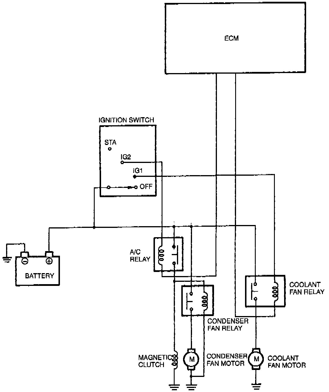 The engine control module (ECM) controls the (radiator) coolant fan and the (A/C) condenser fan to provide more efficient fan control. This improves the performance reliability and stability during idling of an engine.