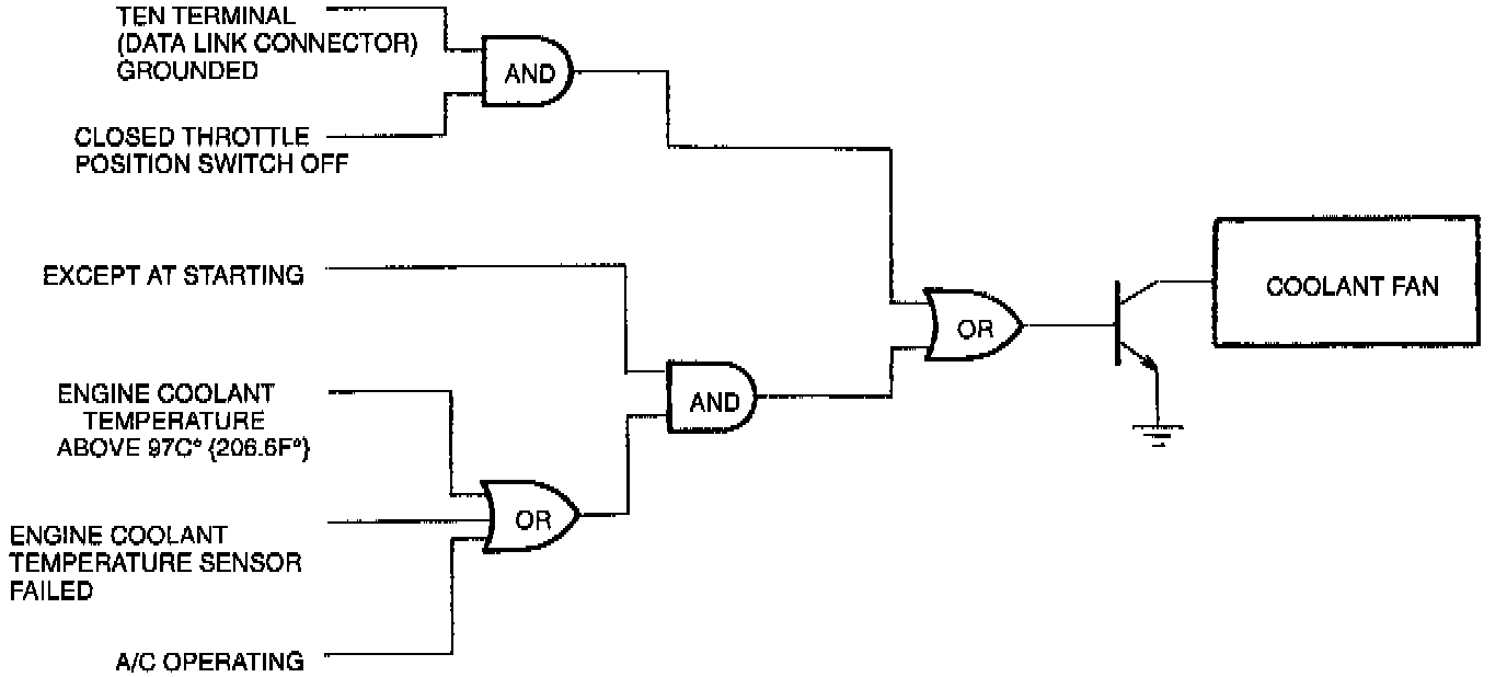 The coolant fan system is OK if it starts to operate with the data link connector TEN terminal grounded and the accelerator pedal is depressed (Ignition switch ON).