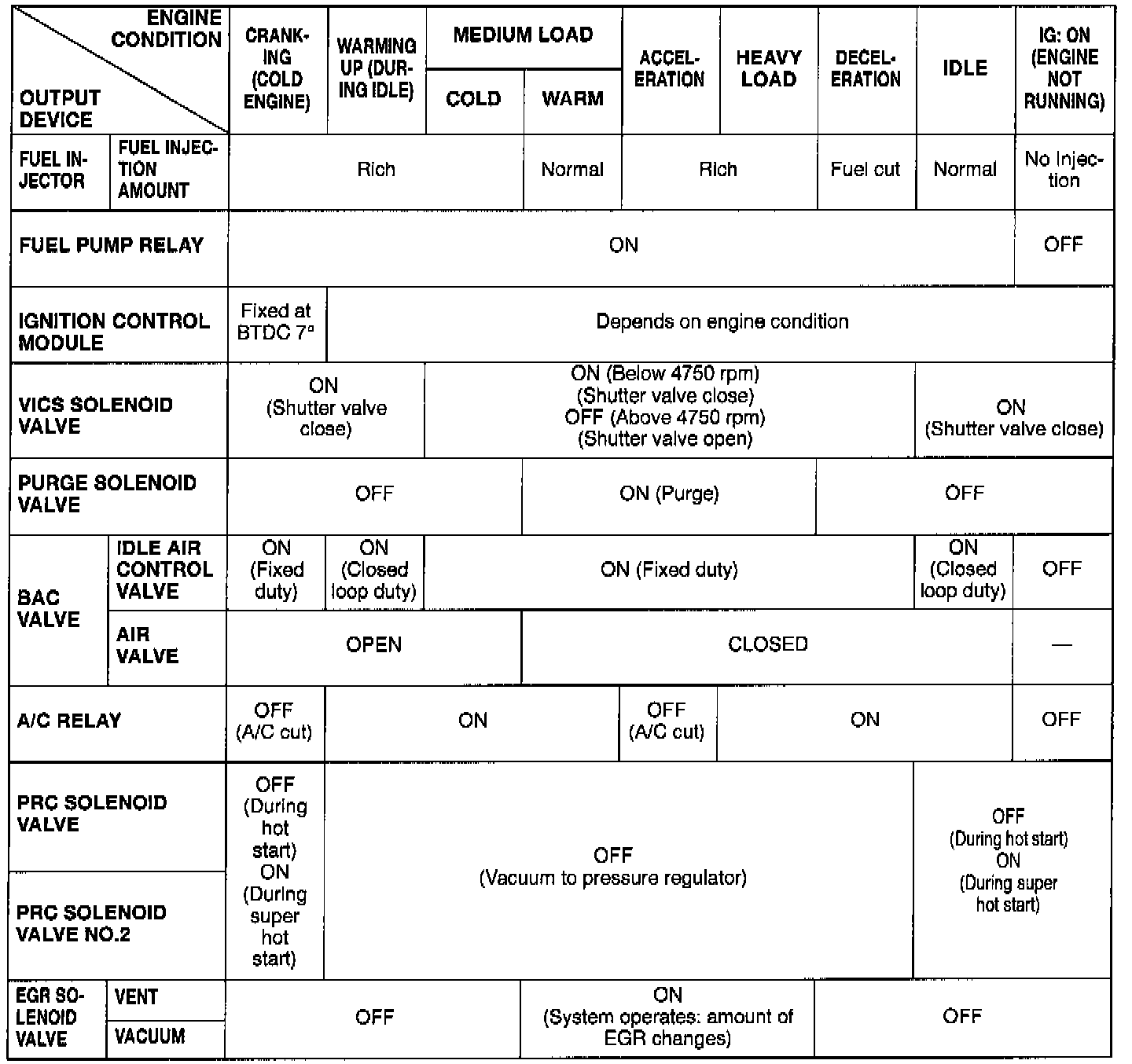 Engine Control Operation Chart
