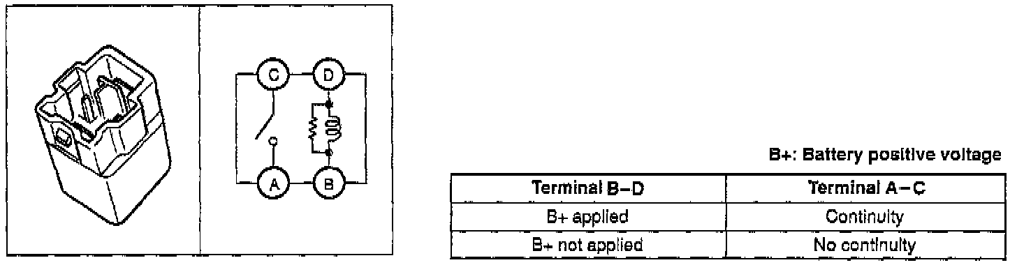 2. Apply battery positive voltage and check continuity between terminals of the relay by using ohmmeter.