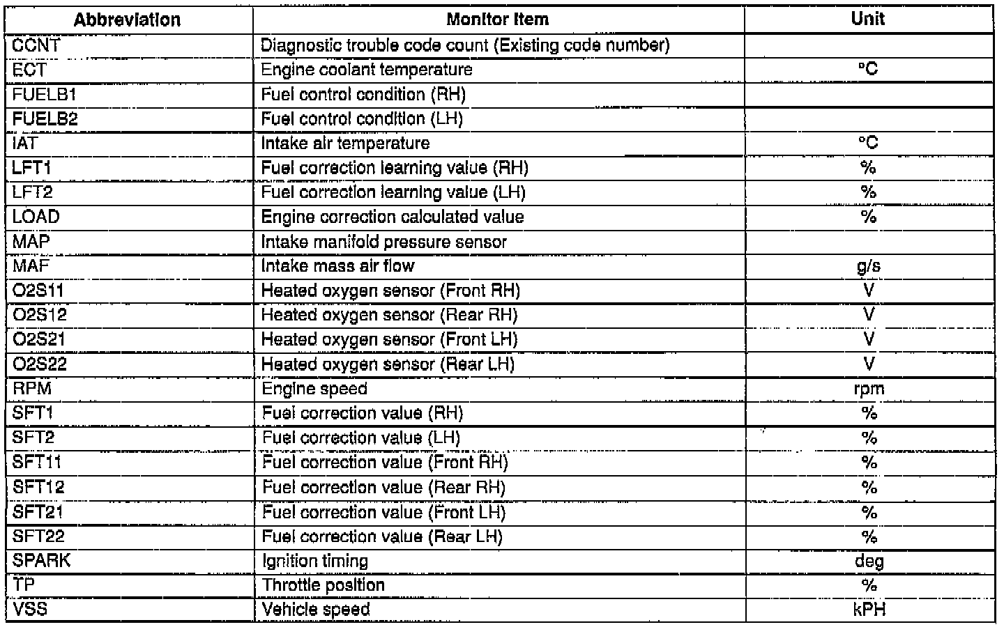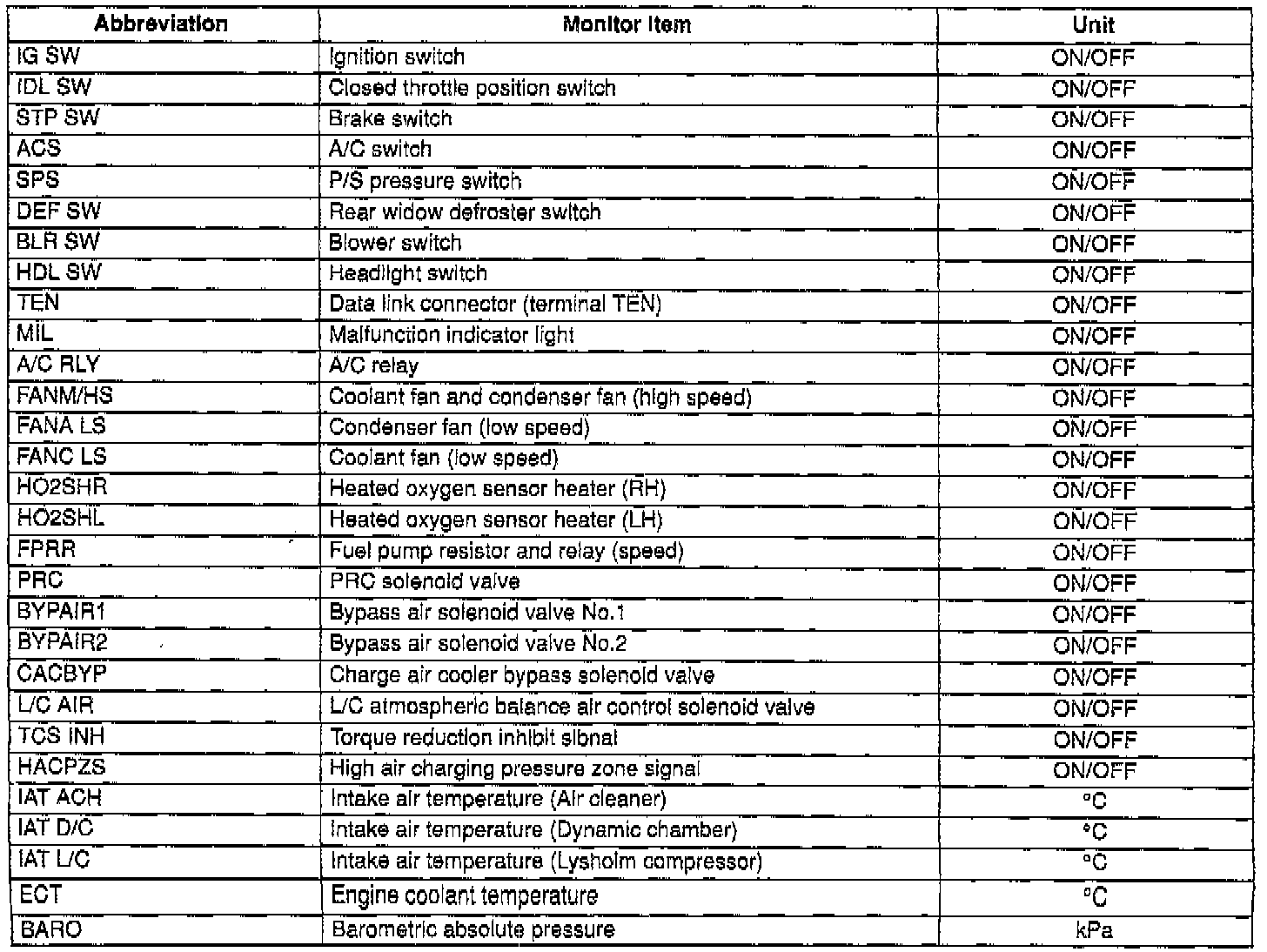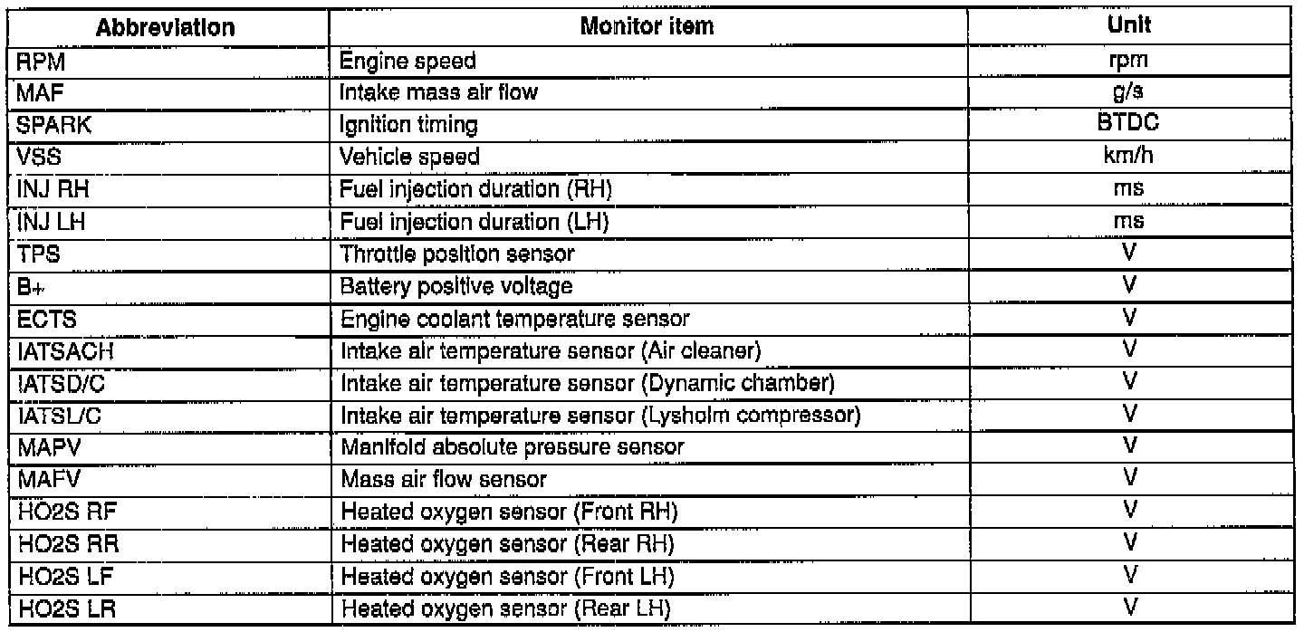 - For inspection of the input/output signals other than listed below, check voltage at the applicable ECM terminal by using the SST (Monitor, Engine Signal).