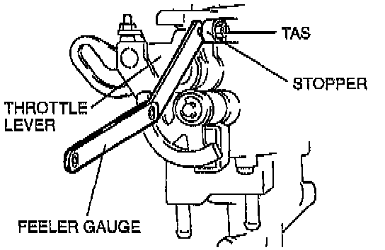 5. Insert a 0.50 mm (0.020 in) feeler gauge between the throttle adjusting screw (TAS) and the throttle lever. Verify that there is no continuity.