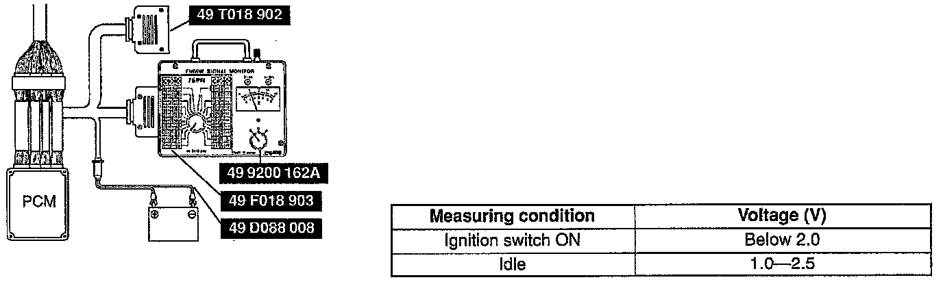 5. If not as specified, inspect the harness and connector between the mass air flow sensor and the PCM terminal.