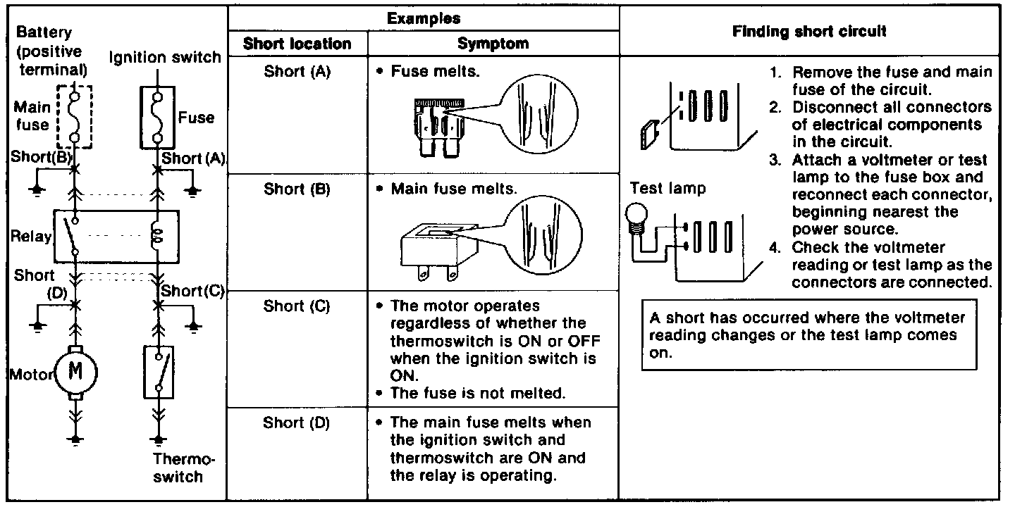 Shorts occur between the power (positive) and ground (negative) sides of a circuit. Therefore, finding a short circuit requires determining how the circuit is routed.Finding Short Circuits-Circuits Not Connected To Control Unit: