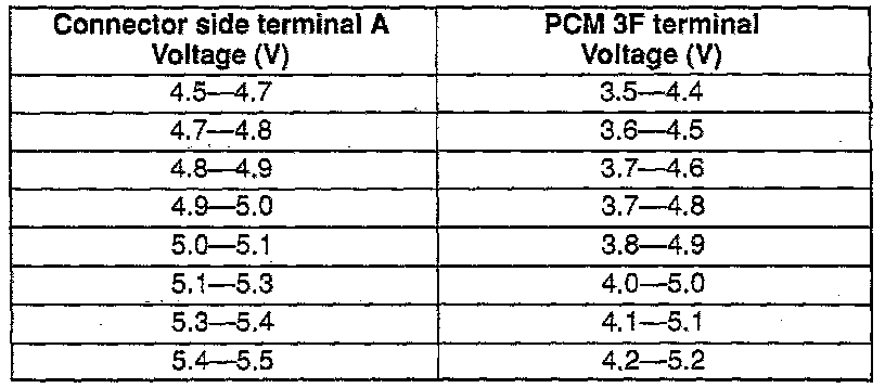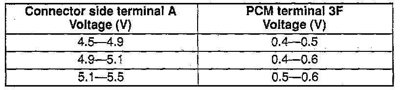 13. Fully open the throttle valve and verify that the voltage at PCM terminal 3F is within the specification.