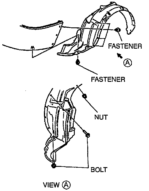 Before removing the fresh-air duct, remove the LH front mud guard mounting bolts, nut, and fasteners shown.