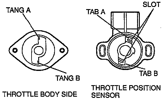 5. Open the throttle valve slightly and catch the tang of the throttle body on the throttle position sensor plastic tabs. Align tang A on throttle body with tab A on throttle position sensor. Note tangs on the throttle body mate with the tab on the throttle position sensor on the side of the tab without a slot.