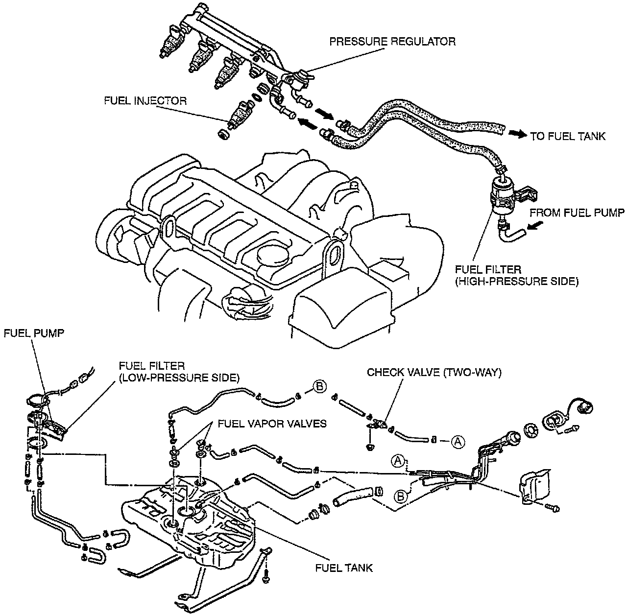 This system supplies the fuel to the fuel injectors at a constant pressure. Fuel is metered and injected into the intake manifold according to injection control signals from the PCM. The system consists of the fuel tank, fuel pump, fuel filters, pressure regulator, pressure regulator control solenoid valve, fuel injectors, and fuel pump relay.