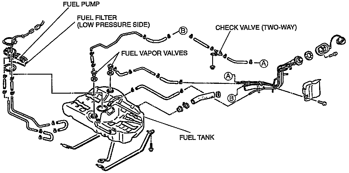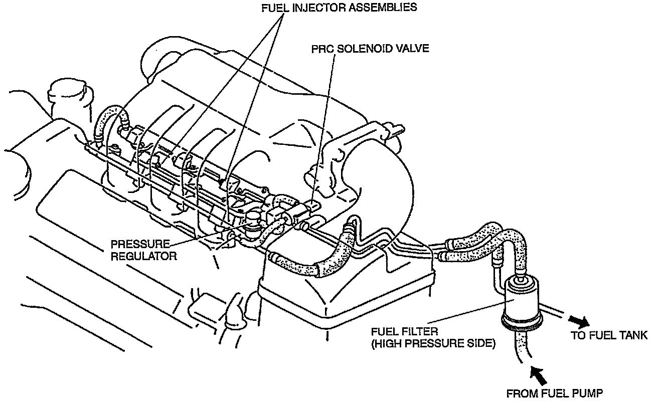 This system supplies fuel to the fuel injectors at a constant pressure. Fuel is metered and injected into the intake manifold ports according to injection control signals from the PCM. The system consists of the fuel tank, fuel pump, fuel filters, fuel distributor, pressure regulator, fuel injectors, and fuel pump relay.